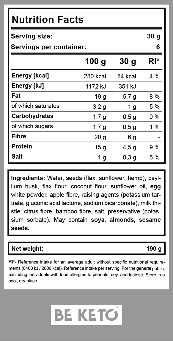 Keto Bread is made from specially selected seeds of flax and sunflower. It contains coconut flour and flaxseed flour, sunflower oil, and free-range egg white protein. The addition of apple, citrus, and bamboo fiber further stimulates metabolism. It contains milk thistle, which protects the liver and kidneys from toxins. Keto Bread BeKeto is packed using the latest MAP technology. Ideal to eat straight out of the package or heated up in the oven. Discover the secret to a healthy, low-carb life.