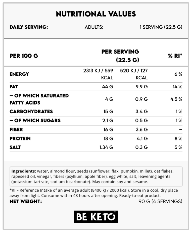 BeKeto Keto Crispy Slim Bread is a modern alternative to classic bread, designed for people on a ketogenic and low-carb diet. Each serving contains only 3.4 g of carbohydrates, as much as 4.1 g of protein, and 3.6 g of fiber, making it the perfect choice for those looking for a light yet filling snack — without blood sugar spikes. Thanks to carefully selected natural ingredients, the bread is not only gluten-free but also free from artificial additives and preservatives. Its crunchy texture and neutral taste make it pair perfectly with both savory and sweet toppings — from nut butters to vegetable spreads.