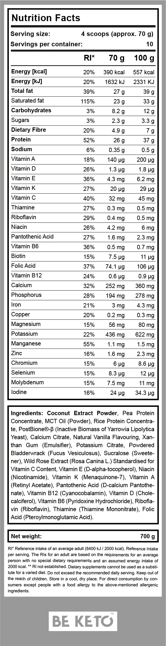 Mix four scoops (approximately 70g) of BeKeto's Keto Meal™ with 300-400ml of water or low-carbohydrate juice.