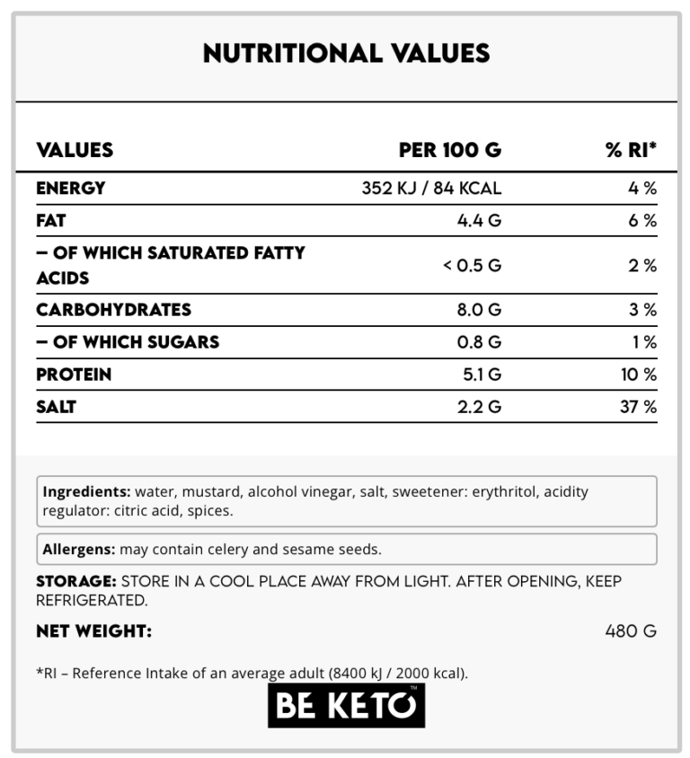 BeKeto Keto Mustard is a product created with people on a ketogenic and low-carb diet in mind. Made from natural ingredients, including mustard seeds, erythritol, and vinegar, it offers an authentic mustard taste that pairs well with many keto meals. Thanks to its zero sugar content, it is an ideal choice for those monitoring their glucose and carbohydrate intake. Perfect for salads, meats, sandwiches, or as an addition to BBQ dishes.