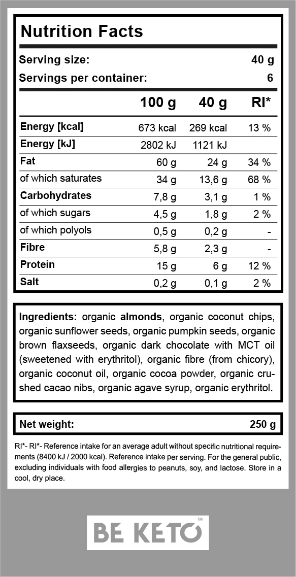 Missing that satisfying crunch of breakfast flakes, but know that regular granolas are loaded with sugar and carbs? We created BE KETO BIO Granola – Cocoa & Chocolate Flavor so that a healthy lifestyle doesn't mean giving up on pleasure! With organic ingredients, an intense chocolate flavor, and perfect crunchiness, you'll fall in love with every spoonful of this unique granola. And all that with just 3.1g of carbs per 40g serving!