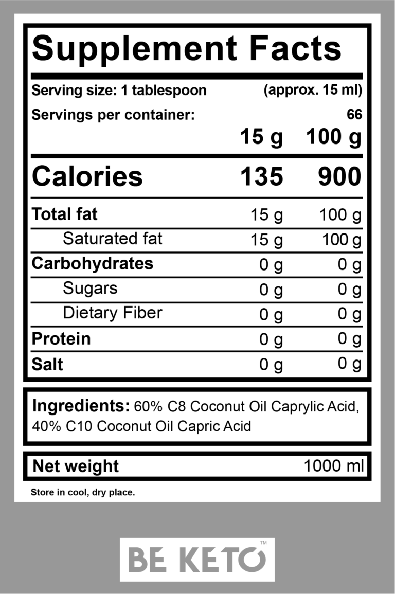 BeKeto™ MCT Oil C8 + C10 is a dynamic blend of high-quality medium-chain triglycerides that support the production of ketone bodies in your body. It is sourced from Canada and the coconuts used to make it come from controlled, organic crops. It is composed of 60% caprylic acid (C8) and 40% capric acid (C10). MCT fats bypass the standard digestive process and go straight to the liver, producing effects within minutes of consumption. These effects include increased energy levels and reduced hunger. It is ideal for people who are new to using MCT oil.