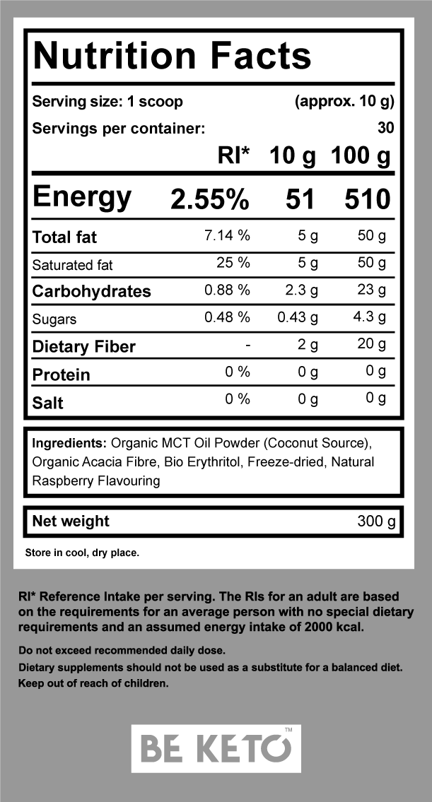 MCT oil powder in Wild Raspberry flavor – your key to higher energy levels and efficiency on a keto diet! Are you at the beginning of your keto diet adventure and still hesitating which supplements to choose? Our MCT Oil Powder is the perfect choice for those who prefer the powder form, but still want to reap the maximum benefits of MCTs. MCTs are Medium-Chain Fatty Acids (Medium-Chain Tryglycerides), which guarantee the greatest increase in energy delivered straight to the brain and body. Your body uses MCTs as a source of energy – it burns them almost instantly, so these acids don’t build up unwanted fat and cause weight gain. What’s more, regular supplementation with MCT oil increases the production of ketone bodies, which are essential for a state of ketosis.