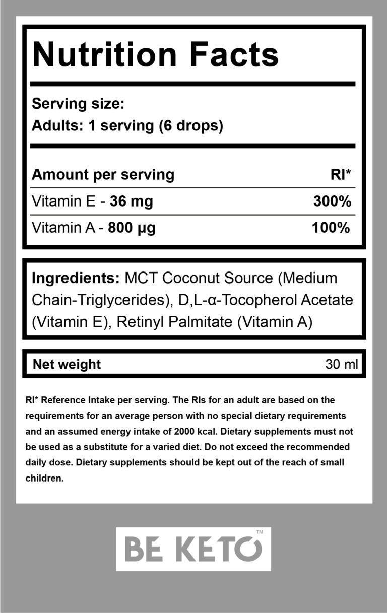 BeKeto Vitamin A+E with MCT oil is an innovative dietary supplement offering comprehensive support for your health and well-being. This unique formula combines the power of vitamin A, essential for cell renewal and maintaining skin and eye health, with the potent antioxidant properties of vitamin E, supporting the immune system. Vitamins in the form of drops ensure direct absorption through the mucous membranes of the oral cavity. Formulated with MCT oil, they further maximize the absorption of nutrients. This perfect blend translates into better results and faster effects.